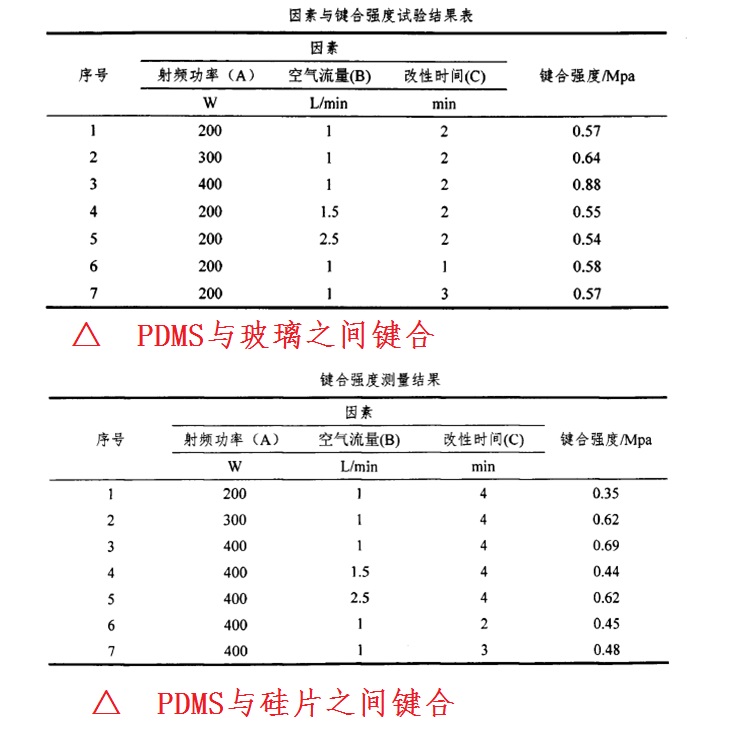 等離子表面處理在PDMS不可逆鍵合前,特別是PDMS同質(zhì)異質(zhì)不可逆鍵合時(shí)的工藝參數(shù),都有可能產(chǎn)生交互式影響。
