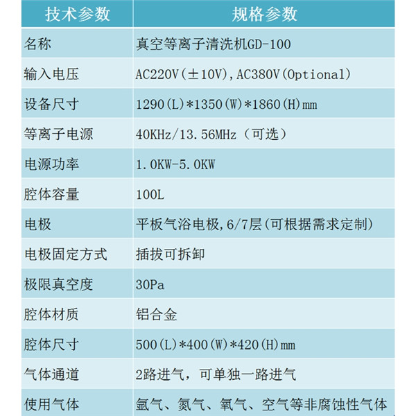 100L工業(yè)等離子清洗機GD-100 技術參數(shù)